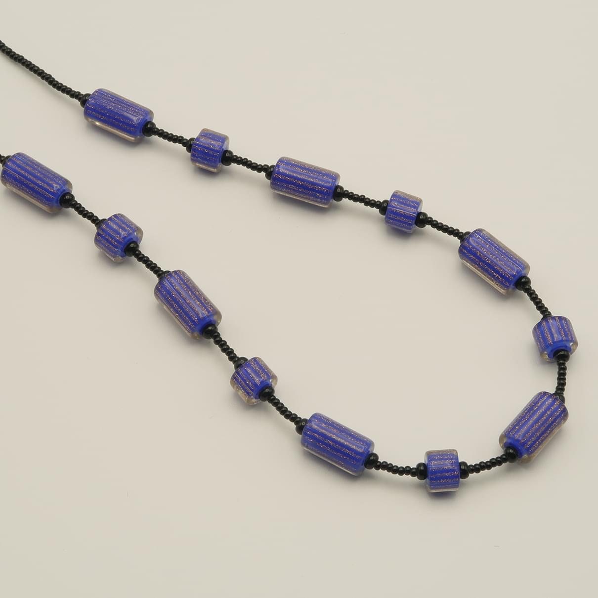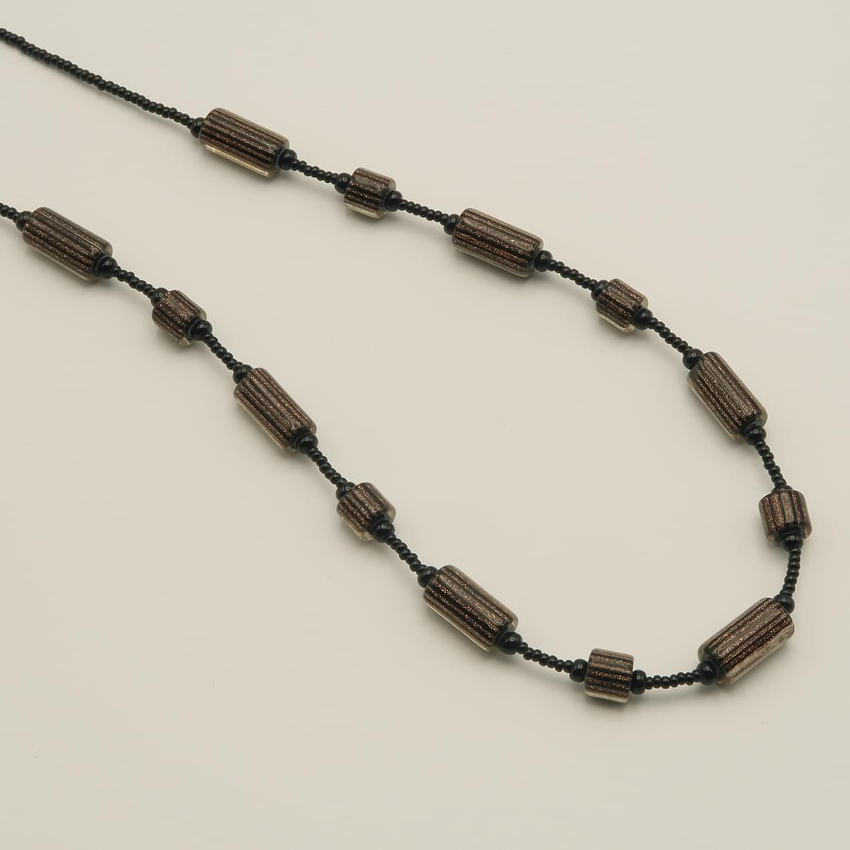 色ガラスに銅砂金を織り込んだ縞模様が魅力のアクセサリー。煌めきというよりも深みのある神秘的な光を放ち、夜空や鉱石を思わせる幻想的な表情を宿します。落ち着きと個性を兼ね備え、大人の女性に知的で洗練された雰囲気を演出する逸品です。