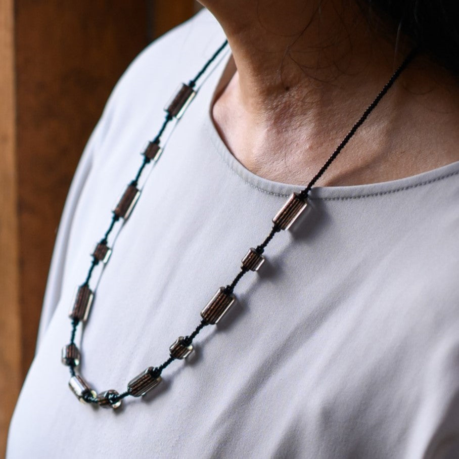 色ガラスに銅砂金を織り込んだ縞模様が魅力のアクセサリー。煌めきというよりも深みのある神秘的な光を放ち、夜空や鉱石を思わせる幻想的な表情を宿します。落ち着きと個性を兼ね備え、大人の女性に知的で洗練された雰囲気を演出する逸品です。
