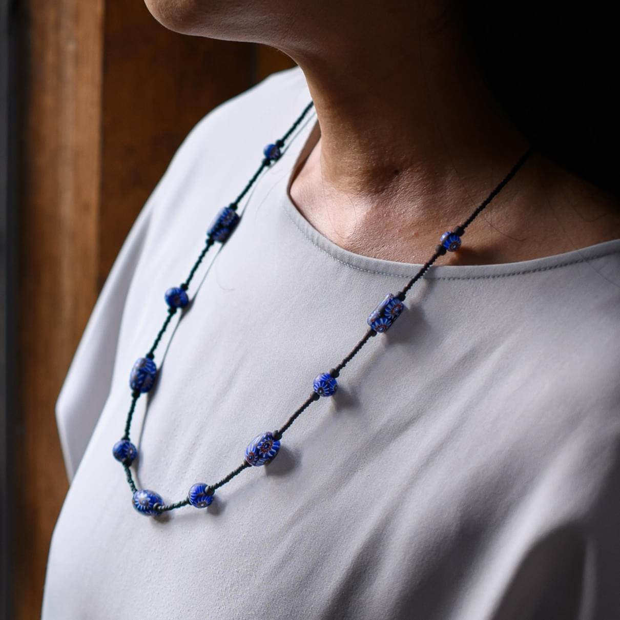 シックなベースカラーに控えめなムリーナ模様をあしらったアクセサリー。華やかさを抑えた落ち着いた色調が、知的で大人の魅力を引き立てます。アンティークモダンな趣を漂わせ、装いに上品なアクセントを添える逸品。日常から特別な場まで幅広く活躍し、洗練された女性にふさわしい気品を宿しています。