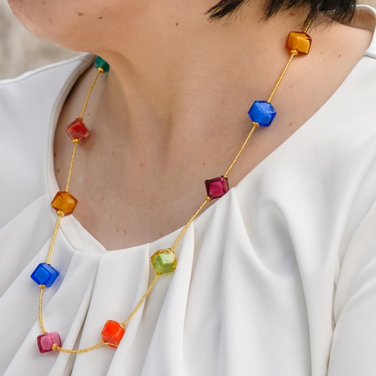 「ガラスキューブ」は、色ガラスの芯を透明なガラスで包み込んだ立方体のアクセサリー。軽やかな色彩のコントラストが生み出すポップでカジュアルな表情は、日常の装いに遊び心を添えます。ヴェネチアンガラスならではのみごとな色合いは、身に着けるだけで気分も明るく彩るチャーミングな逸品です。