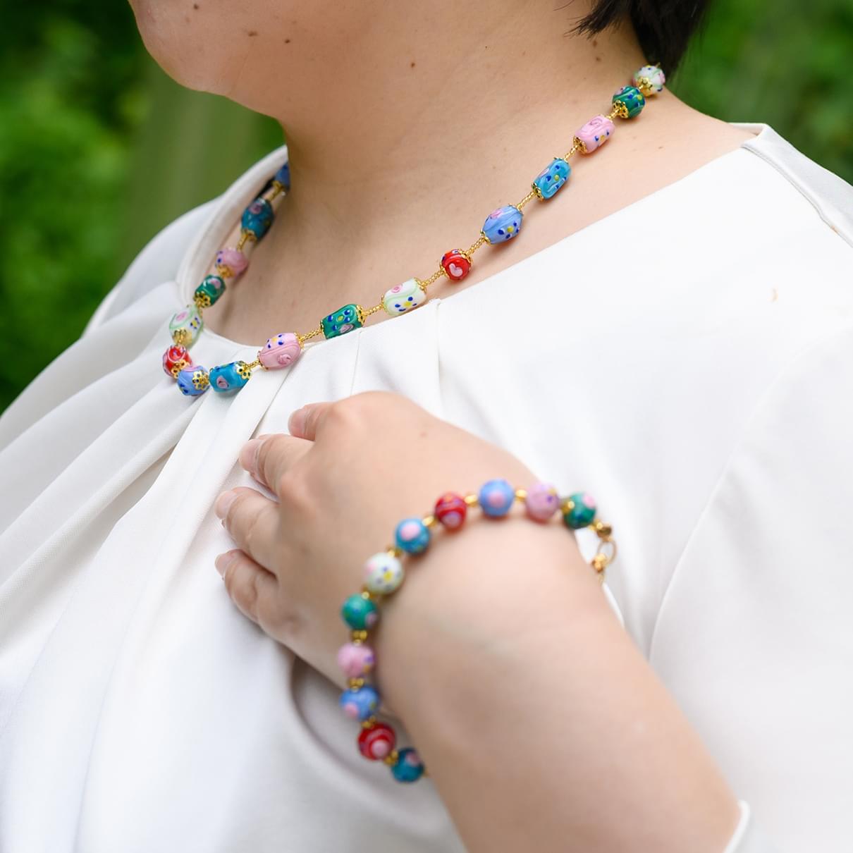 「フィオラート」は、ガラスに咲く花模様が愛らしいアクセサリー。ひとつひとつの花は職人が極細のガラス棒で描いた繊細なアートで、花園にいる夢を見るよう。胸元や耳元に添えれば、花々が舞い降りたかのように華やぎ、装いに優美なロマンチックさを添える逸品です。