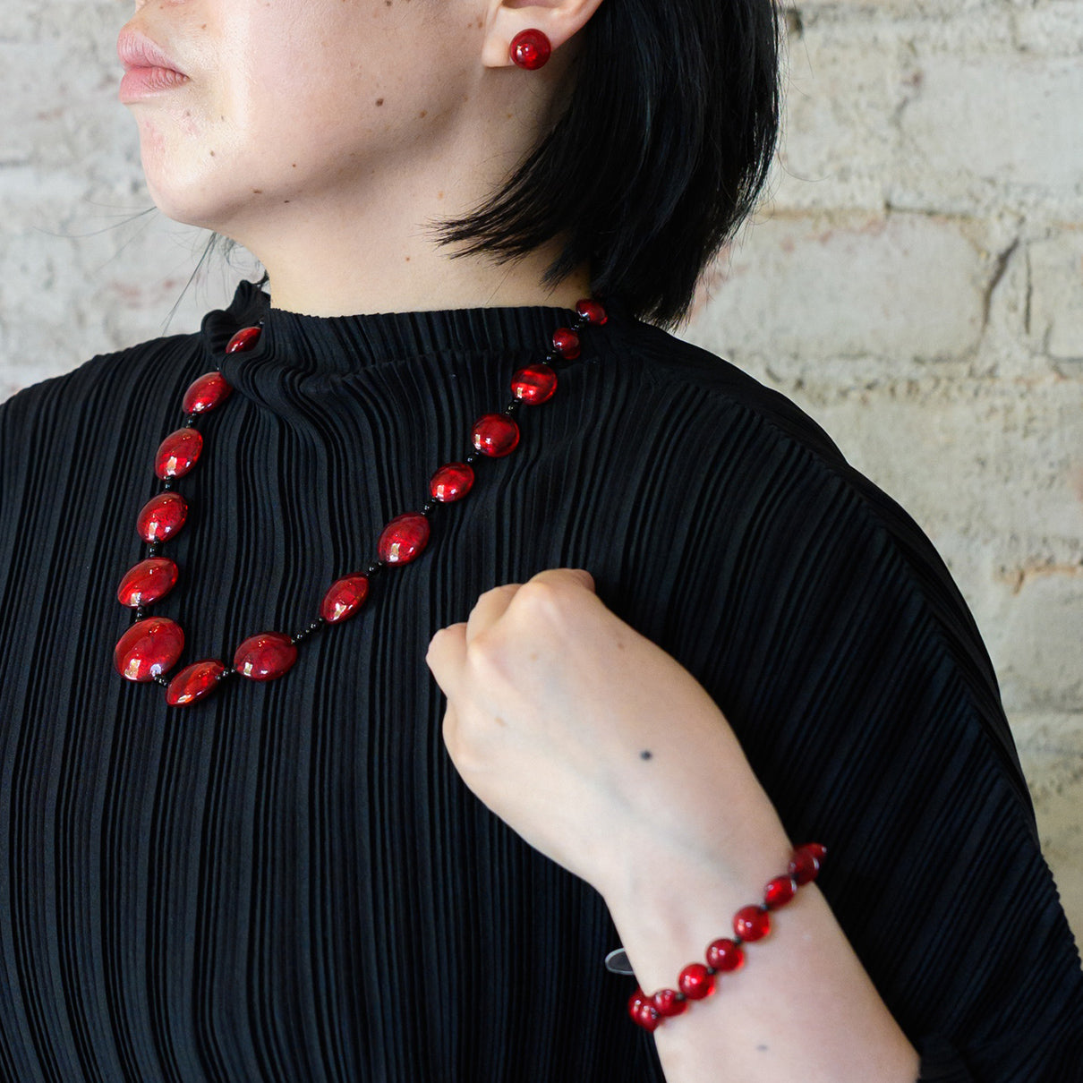 「ロッソオロ」は、ヴェネチアを象徴する深紅に金箔を閉じ込めた華麗なアクセサリー。金箔を包んでいるからこその艶やかな赤は世代を超えて愛されてきた色彩で、装いに気品と存在感を与えます。纏うだけで華やぎが広がり、大人の女性の装いを格調高く演出する逸品です。