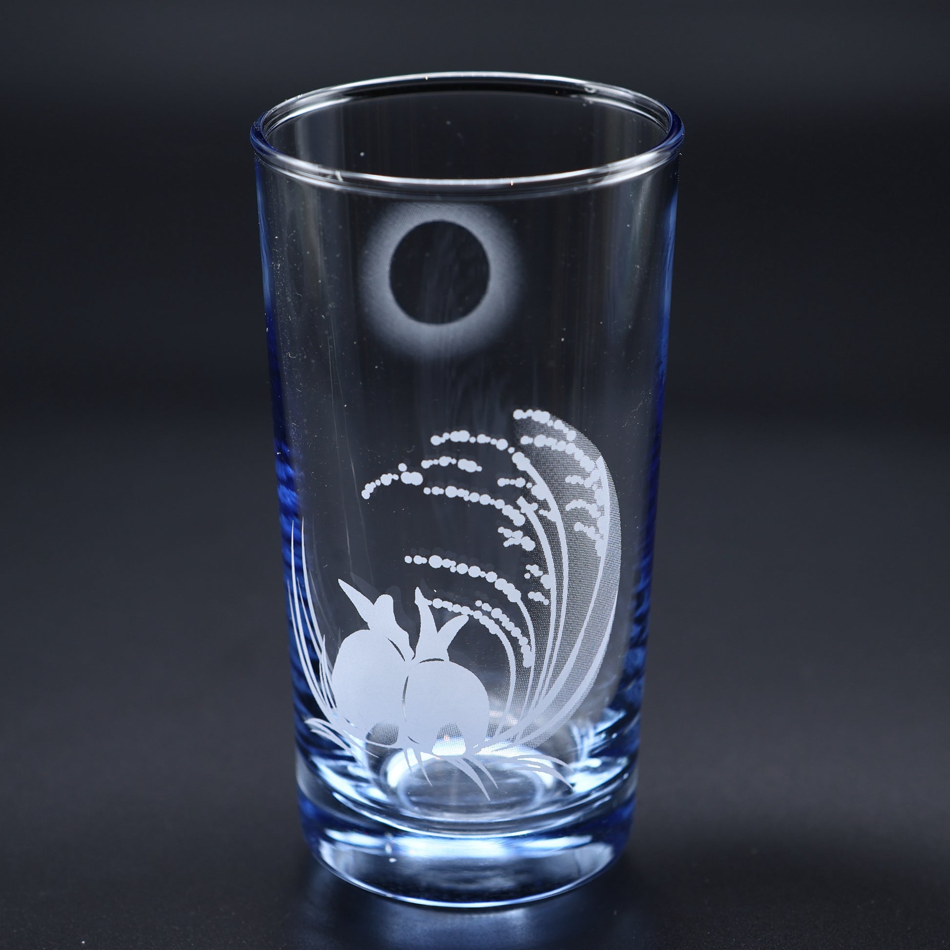 箱根ガラスの森美術館がある仙石原は雄大なススキ草原が有名で、秋には日に照らされ黄金に輝く風景はとても美しく、人気のスポットです。ススキ野散策の前後に来館されるお客様も多く、地元としてススキをテーマにしたグラスを作りたいと考え、カラーグラスに「ススキ草原で月見するウサギのカップル」をシルクサテン転写した「ほのぼの」タンブラーです。
