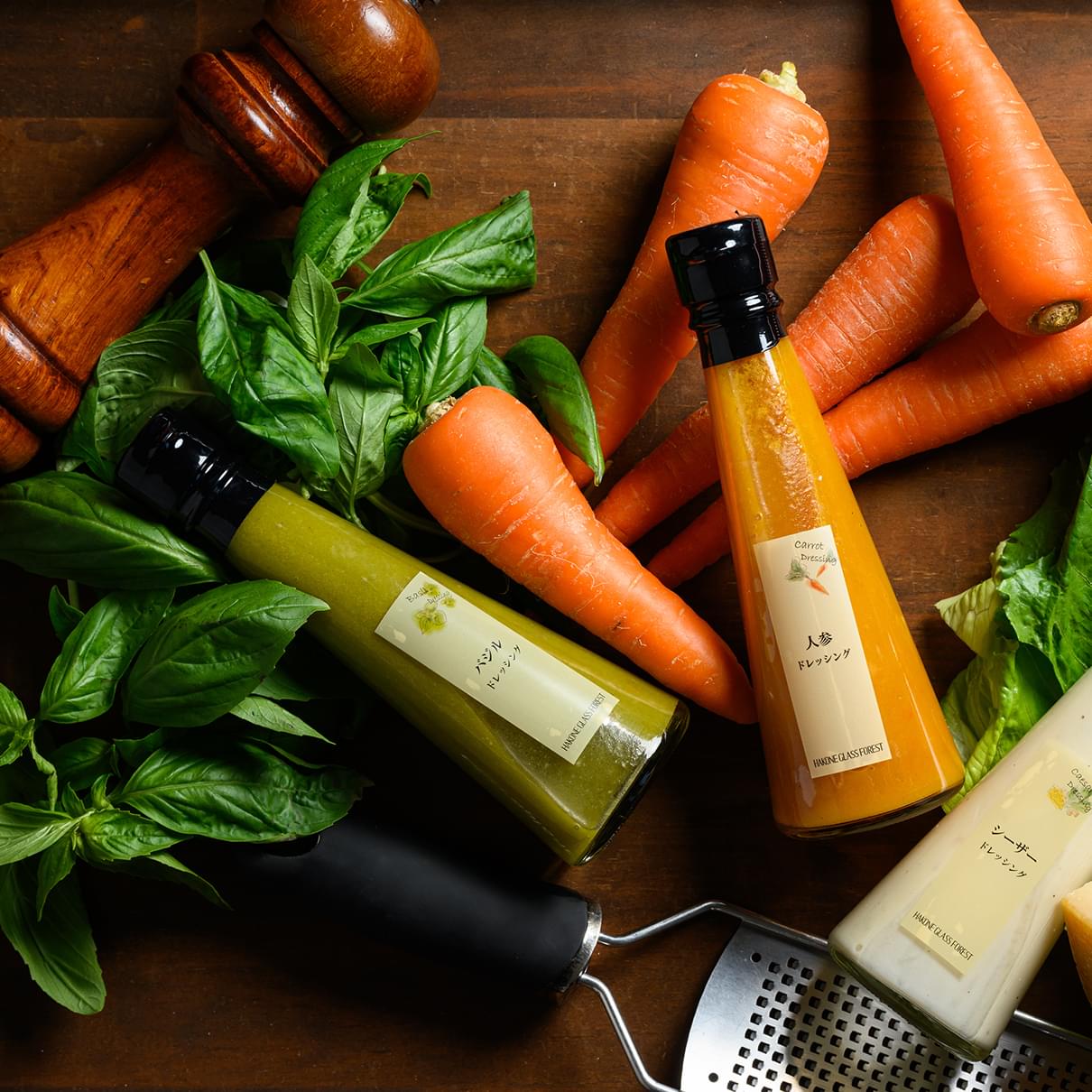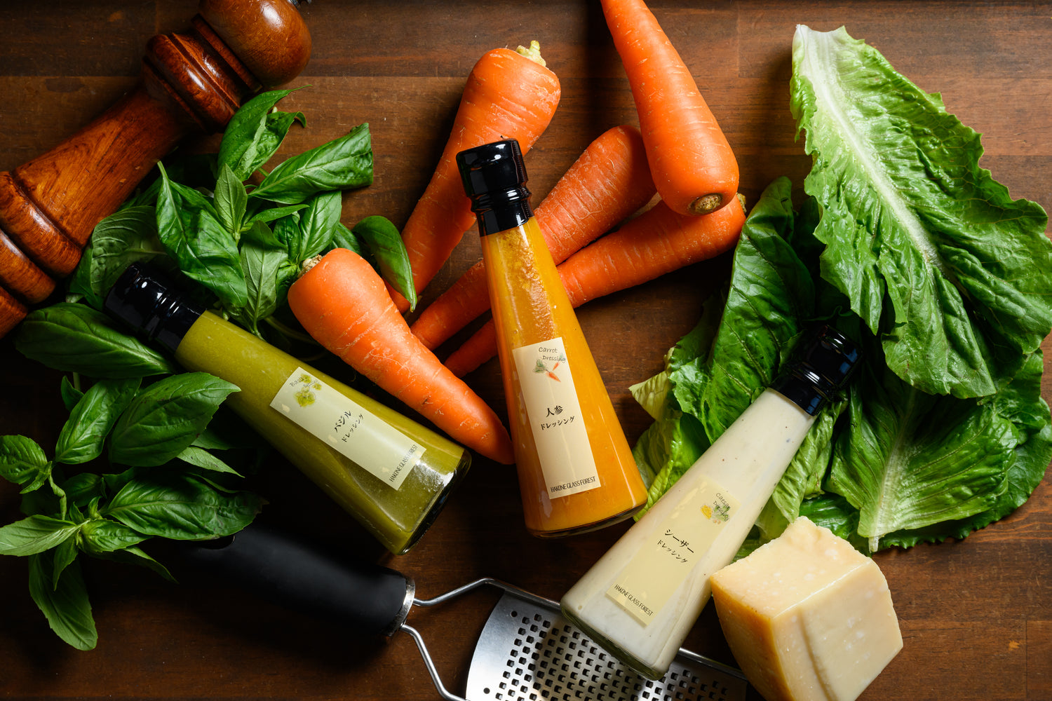レストランテーストをご家庭でもという願いから作られた逸品。素材感を大切に隠し味に白だしと醤油を効かせた馴染みある味わいの人参ドレッシング、3種のチーズとアンチョビ&ニンニクのアクセントが作り上げる濃厚で絶妙なバランスのシーザードレッシング、新鮮な朝摘みバジルを風味豊かに閉じ込めたバジルドレッシング。いつものサラダが大変身。