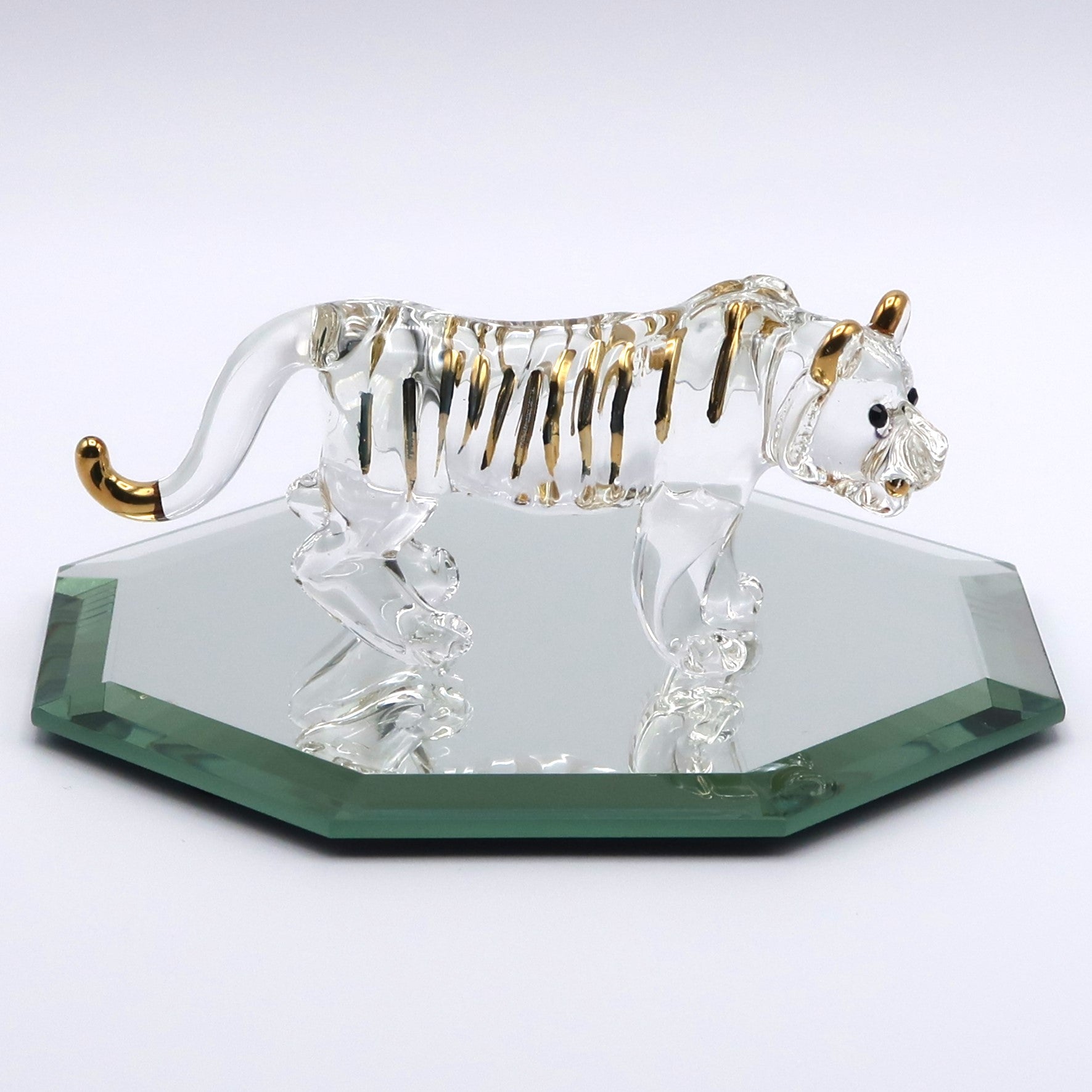 バーナーワークの技法で一体ずつ丁寧に仕上げられたガラス工芸。透明感のある輝きとアクセントの金彩が調和し、飾るだけで凛とした華やぎを与えます。干支は古来より家族や暮らしを守る象徴とされ、毎年のお正月飾りや贈り物としても喜ばれる存在。風水で吉とされる八角の鏡プレートに映える姿が、皆様のご多幸を呼び込みます。