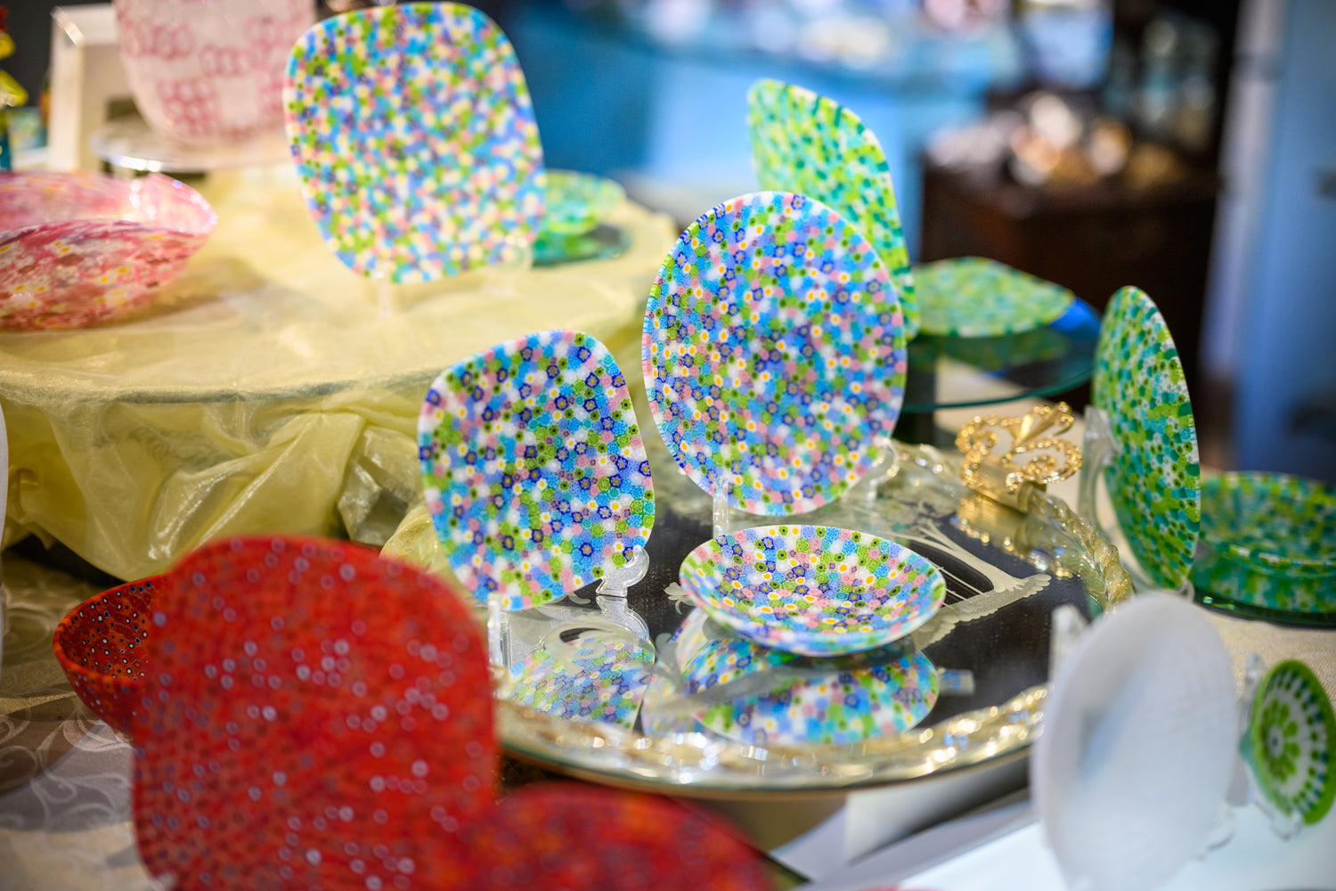 「ミルフィオリ器」は、千の花を意味するミルフィオリの名のとおり、色とりどりの花が咲き誇るようなヴェネチアンガラスの逸品。ガラス棒“ムリーナ”を切り出し、一粒一粒を敷き詰めて溶着させる伝統技法から生まれる文様は、まるでモザイクの花畑のよう。光を受けてきらめく器は、日常の食卓に華やぎと格調を与え、特別なおもてなしや祝いの席にもふさわしい存在です。