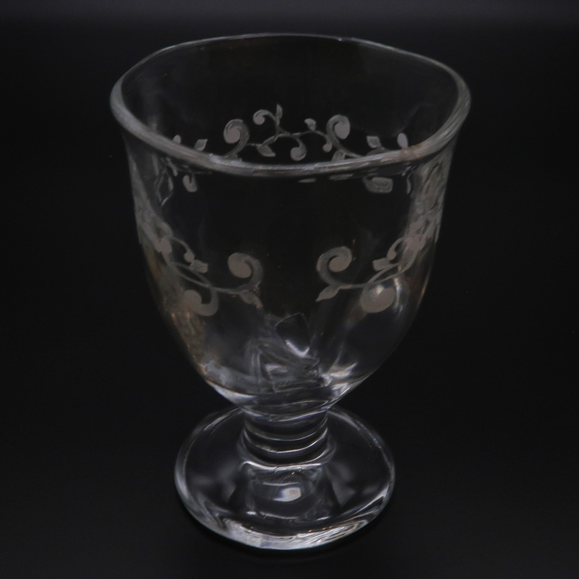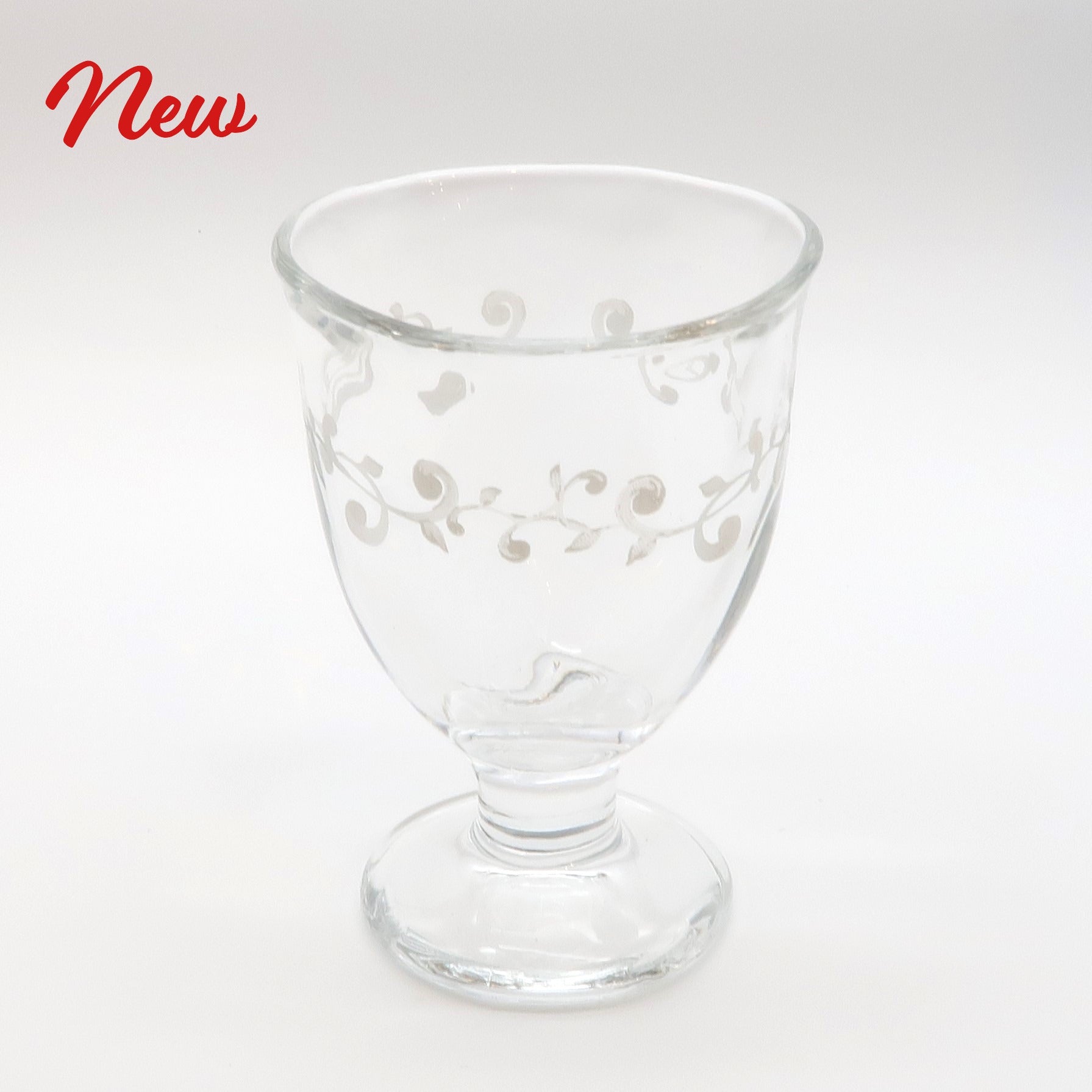 オリジナルアイビー柄がプリントされ、グラス下部には台が付き安定してご使用いただけます。デザートや食前酒はもちろん、小さなお花を飾ってインテリアとしてもお楽しみいただけます。
