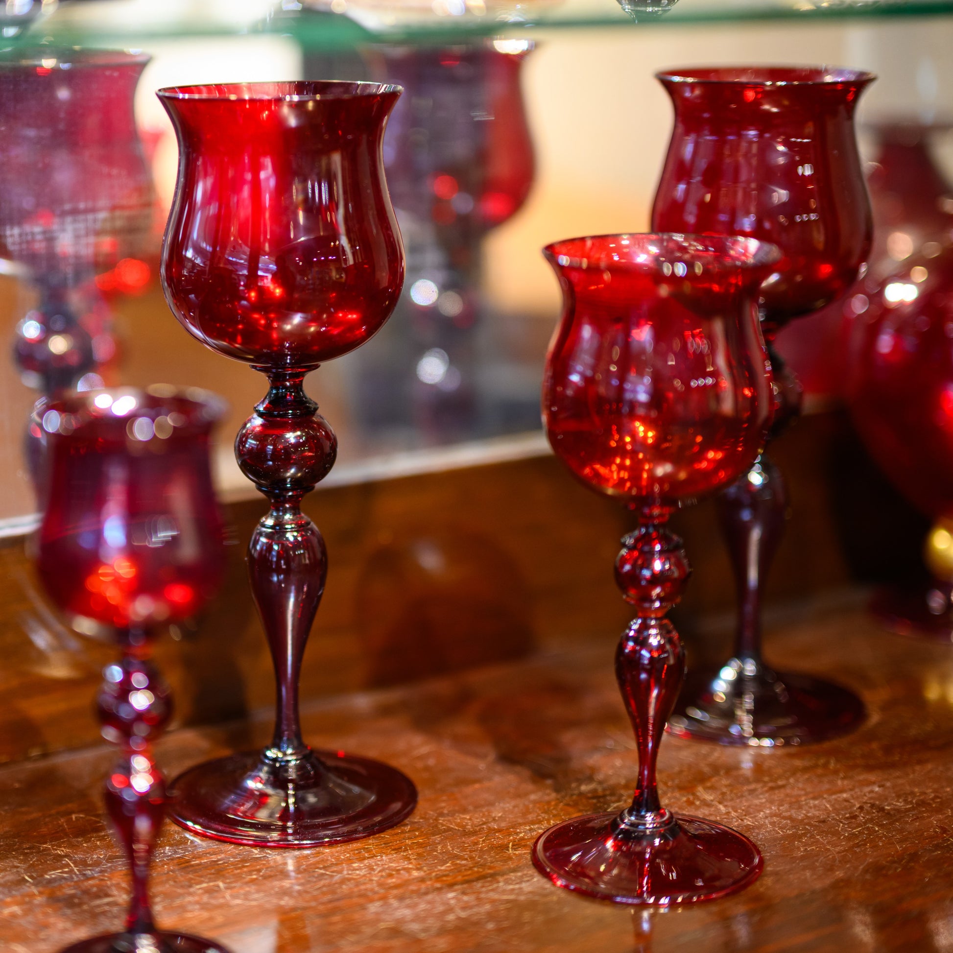 ヴェネチアングラスを象徴する深紅のゴブレット。1955年公開の映画『旅情(Summertime)』に登場し、世界中を魅了した名品です。艶やかな赤は情熱と華やぎを宿し、食卓やインテリアに優雅な彩りを添えます。手に取れば往年のロマンが蘇り、今もなお心をときめかせる存在。世代を超えて愛される、特別なグラスです。
